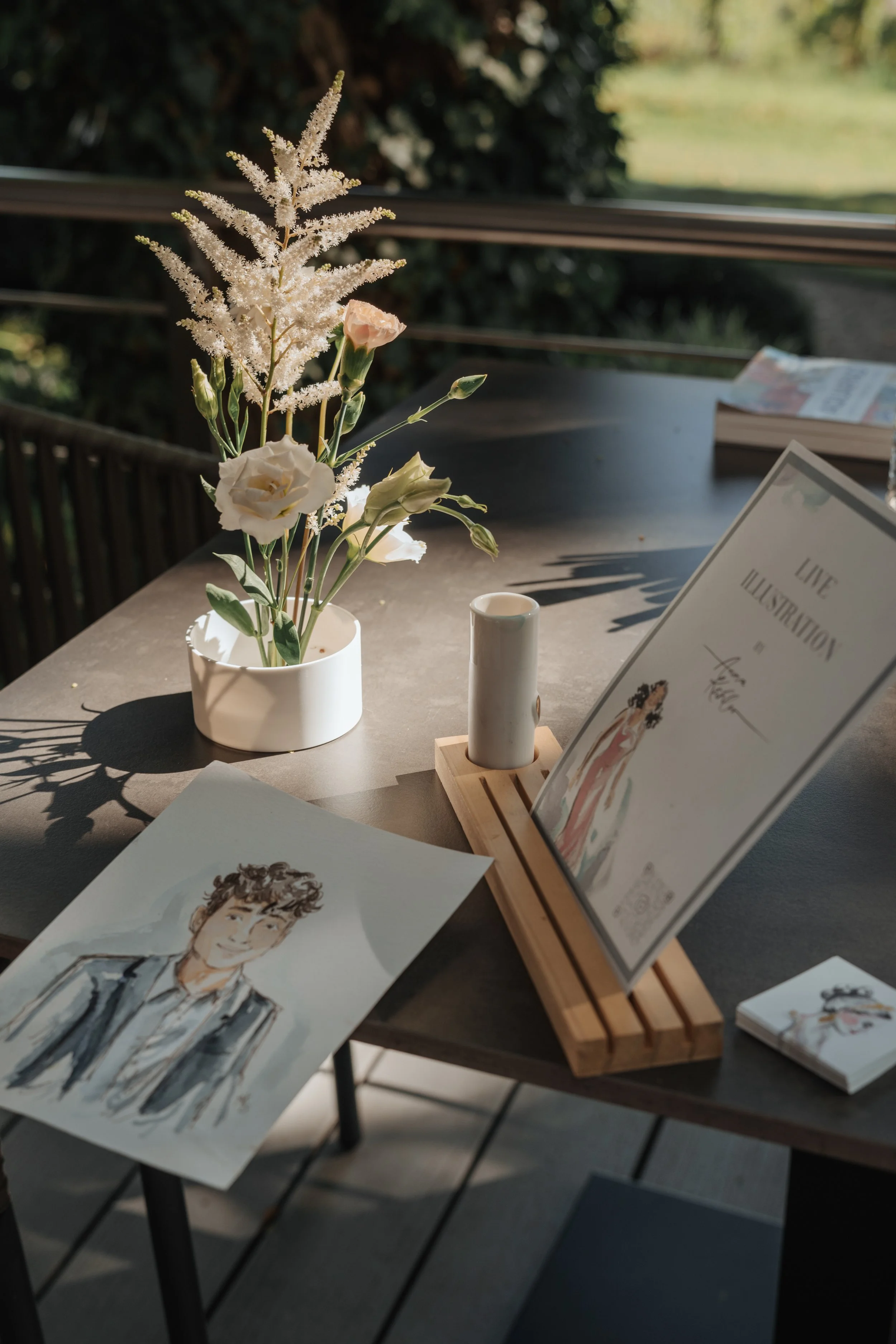 J’apporte tout le matériel nécessaire : papiers, couleurs et bonne humeur. Vous n’avez qu’à prévoir un emplacement agréable, bien éclairé et un peu d’espace pour accueillir les rencontres. Ensemble, nous trouvons le bon moment pour que les illustrations s’intègrent naturellement à votre fête – que ce soit pendant le vin d’honneur, le dîner ou entre deux animations.